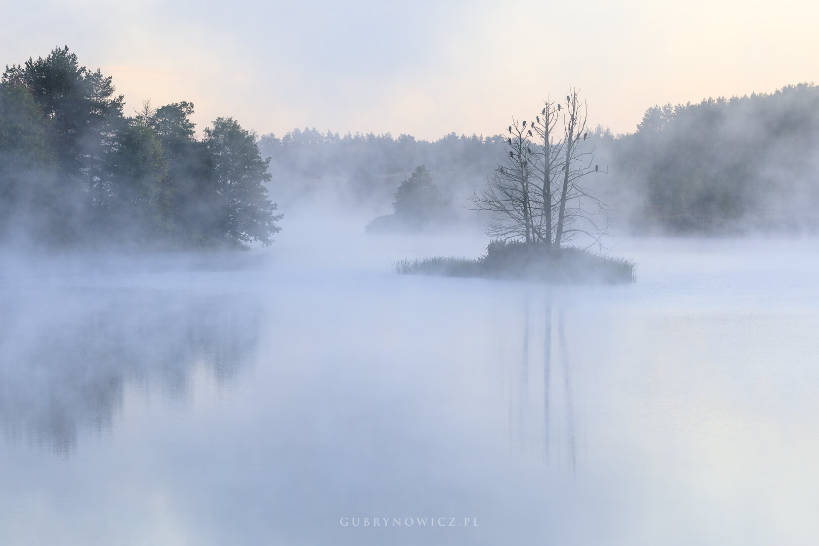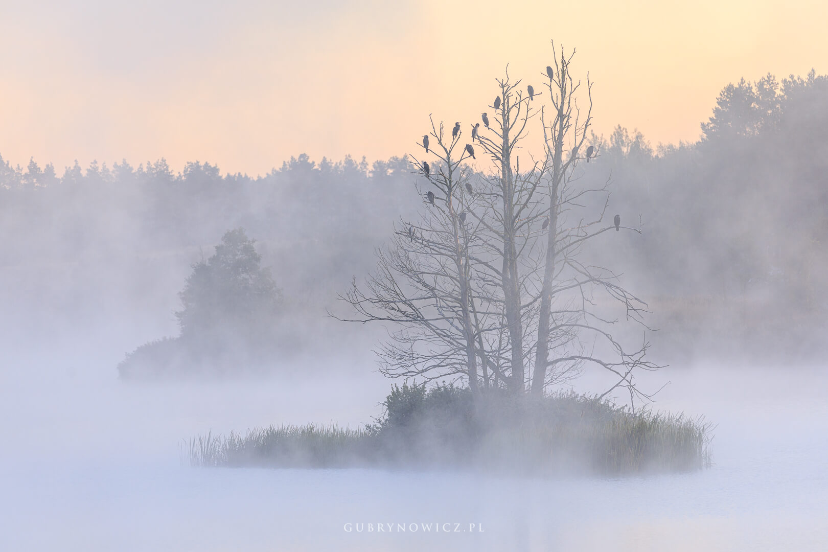 Połowa września w Polsce to czas, kiedy co prawda jeszcze za wcześnie by mówić o kolorach jesieni, ale jest większa szansa na poranne mgły i tzw. babie lato. A to już wystarczający powód, by warto było ruszyć o świcie w teren. Tak było i tym razem. Licząc na ciekawe kadry podjechałam nad Drwęcę. Mgła nie zawiodła. Pastelowo, delikatnie falowała wśród drzew, pomiędzy taflą wody, a brzegami wyspy. Wyspy kormoranów.