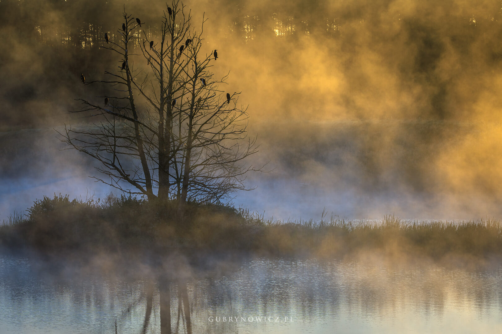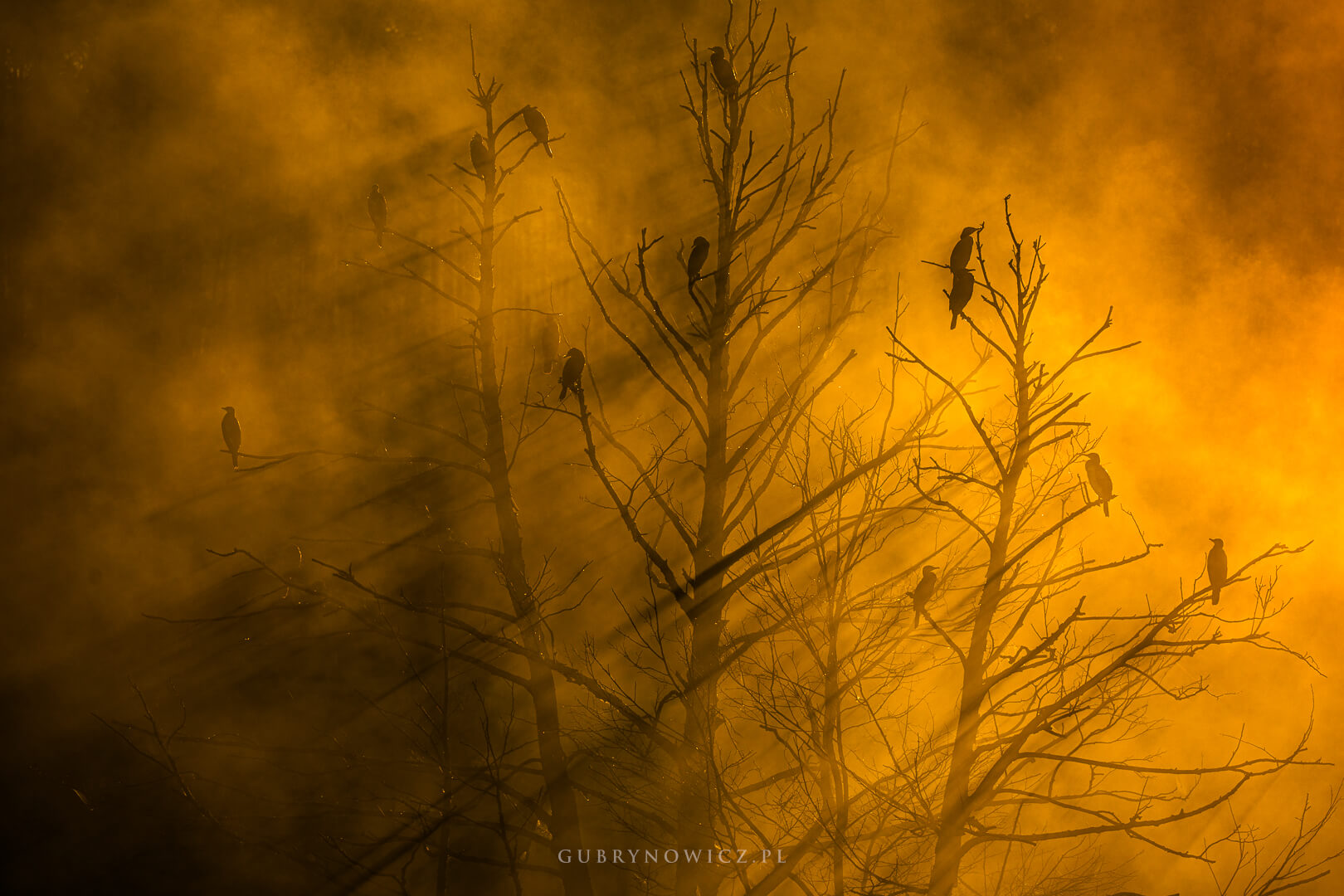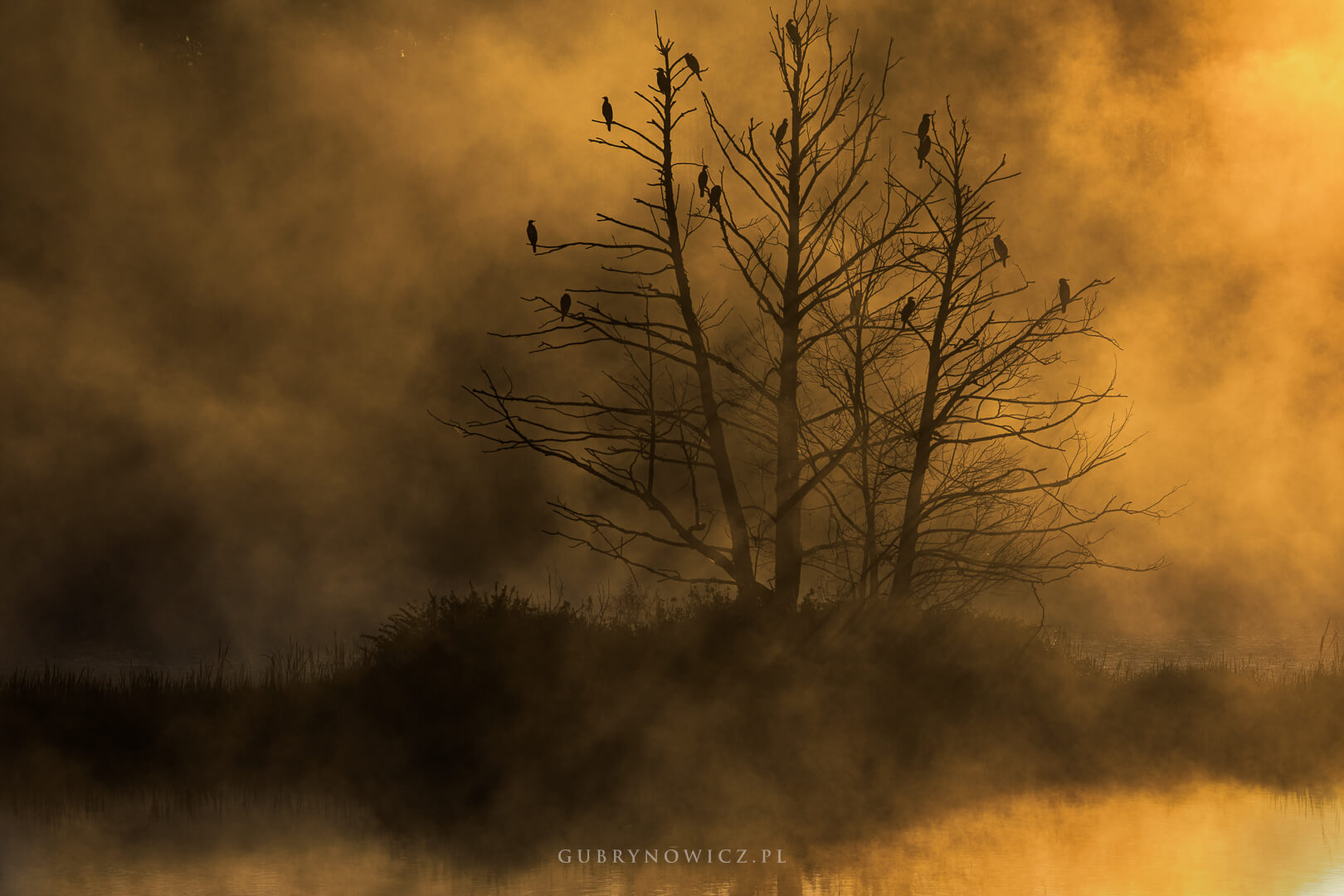 I nagle wybuchło. Chlusnęło złotem, jakby kto farbę wylał prosto z wiadra. Prosto w mgłę. Zakotłował się obraz. Światło przebiło mgłę. Trafiło w kormorany, strażników ciemności. Walka światła z ciemnością trwała kilka minut. A może jeszcze krócej? Zaczęłam łapać kadry – szersze (przepalone!), węższe, w pionie, poziomie. Jak w przypadku wcześniejszych kadrów korekta ekspozycji szła na plus, teraz musiałam mocno nie doświetlać.