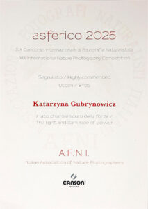 Konkurs Asferico to międzynarodowy konkurs fotografii przyrodniczej, organizowany przez włoskie stowarzyszenie fotografików przyrody (Italian Association of Nature Photographers) należy do jednych z bardziej prestiżowych w dziedzinie fotografii przyrody. W 2025 odbyła się już 19. edycja konkursu, do którego zgłoszono ponad 16 000 prac z 43 krajów. Tym większym zaszczytem dla mnie było znalezienie się w wąskim gronie finalistów. Już po raz drugi w historii.